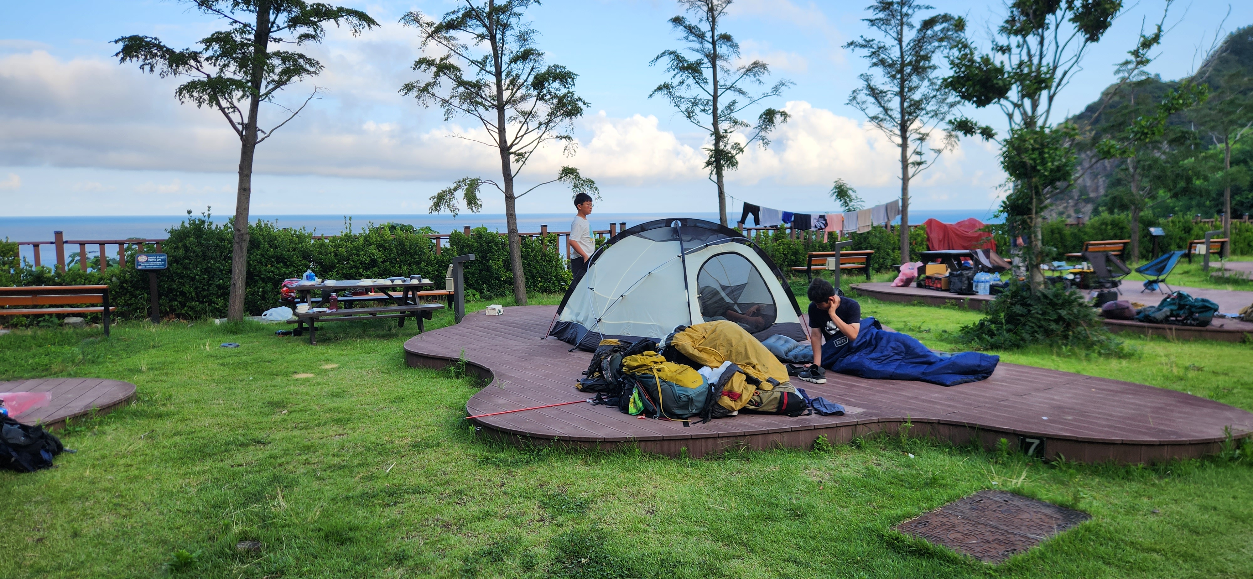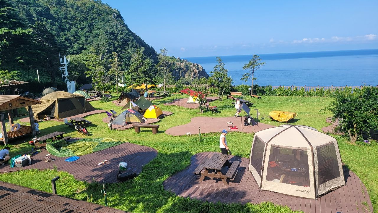 깃대봉 등반을 마치고 학포야영장으로 향한다. 학포야영장은 울릉도, 아니 대한민국에서도 손꼽히는 아름다운 야영장이다. 바닷가 중턱에 자리잡아서 탁트인 조망과 바닷가 기암괴석들이 그 아름다움을 더 한다. 그런데 여기는 인터넷 예약을 받지 않는다. 인터넷으로 예약을 받은 결과, 너무 일찍 매진되어 많은 민원이 발생하였다. 결국 예약은 받지 않고, 아침 9시 직원이 출근하여 순서대로 텐트 자리를 배정한다. 텐트 자리도 8면 밖에 되지 않는다. 배타고 오후에 도착하는 우리 일정 상 아침 일찍 줄을 서 텐트 자리를 잡는 것은 불가능하다. 결국 울릉도 지인들에게 부탁하기로 한다. 결국 지인 두분이 아침 4시부터 줄을 서서 텐트 2동 자리를 구한다. 이 자리를 빌어 수고해 주신 민정화씨에게 감사의 말씀을 전한다^^