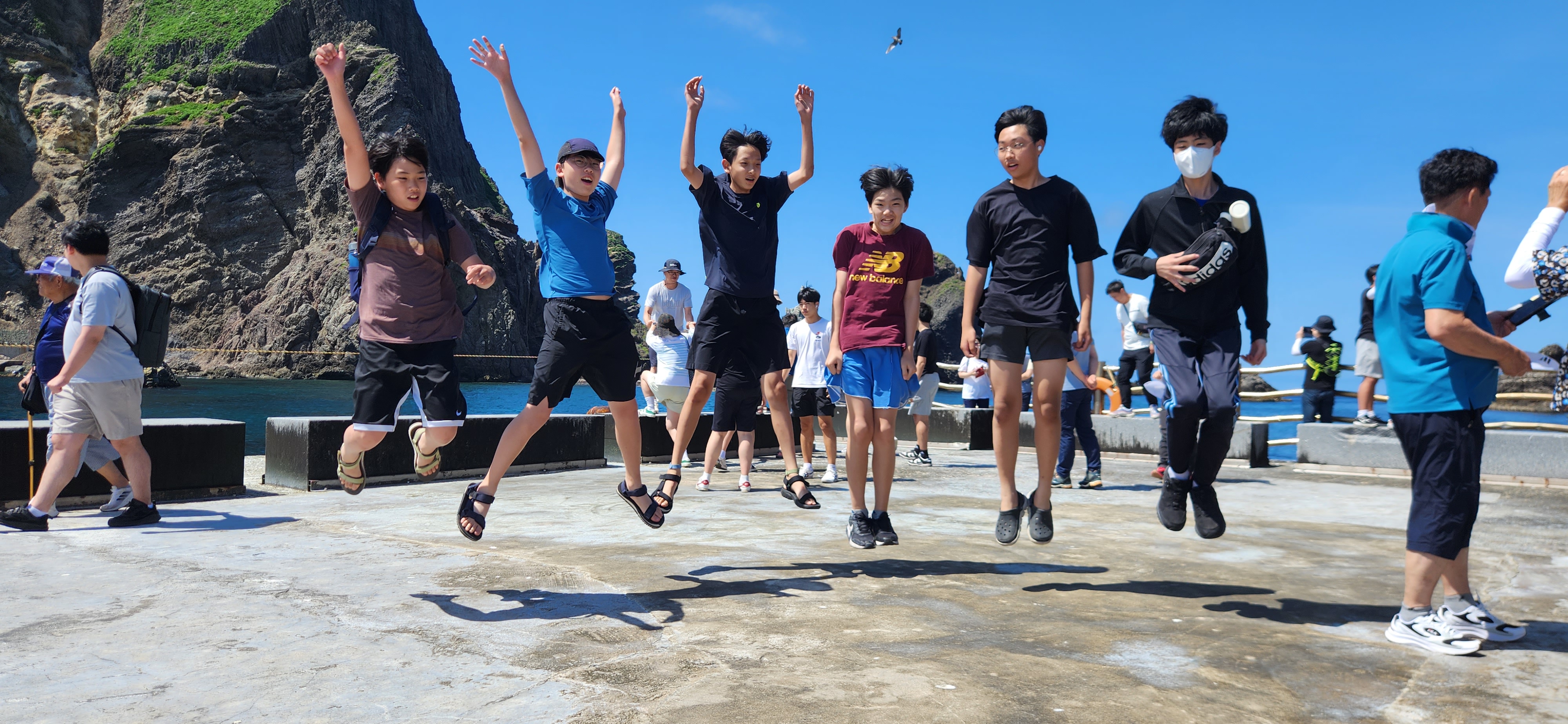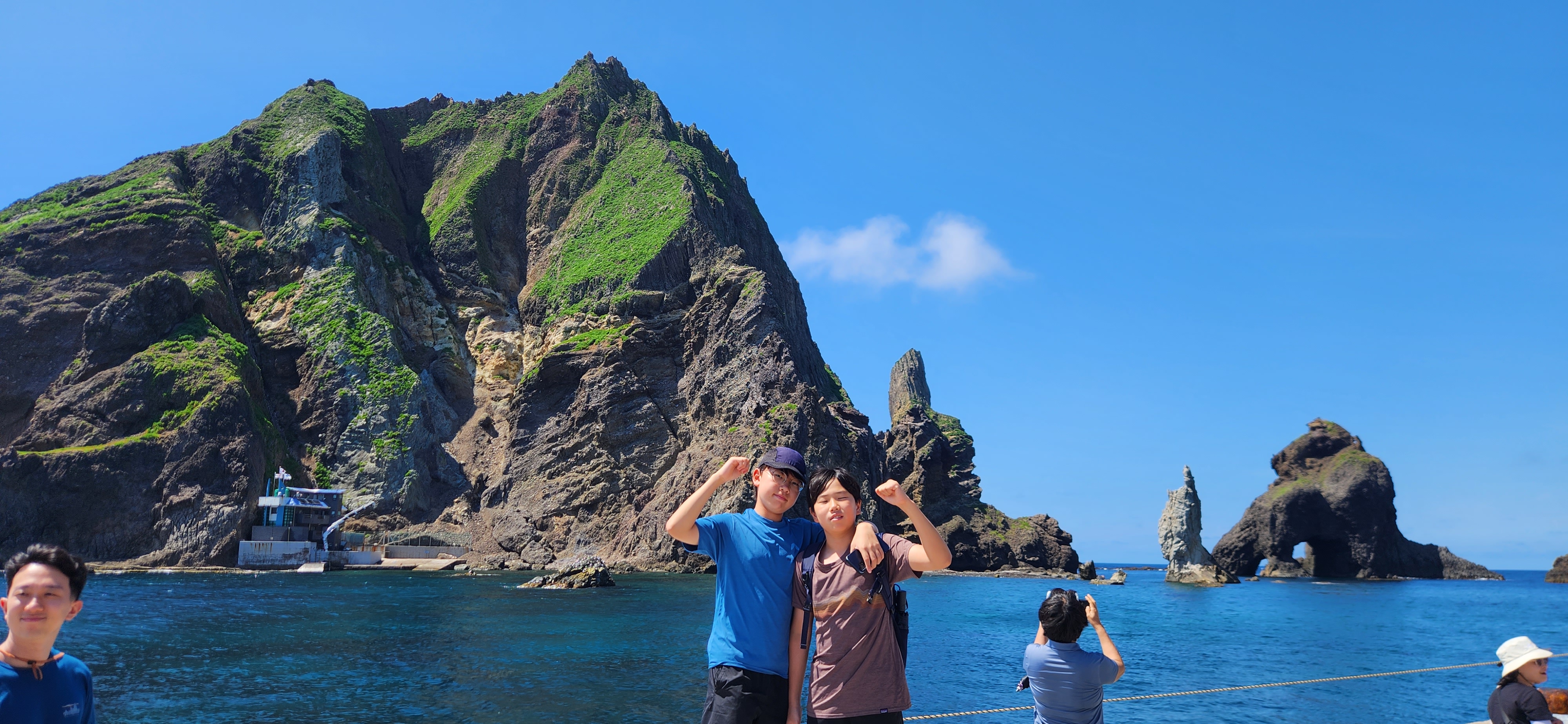 독도 도착. 잔잔한 물결 덕분에 독도에 입도한다. 10년 전 왔을 때는 높은 파도로 섬만 한바퀴 돌고 가서 아쉬움이 많이 남았었다. 쾌청하고 아름다운 하늘과 어울리는 독도에 상륙한다. 국토 최동단 독도, 아이들도 감격스러운지 사진을 찍으며 이리저리 뛰어 다닌다.