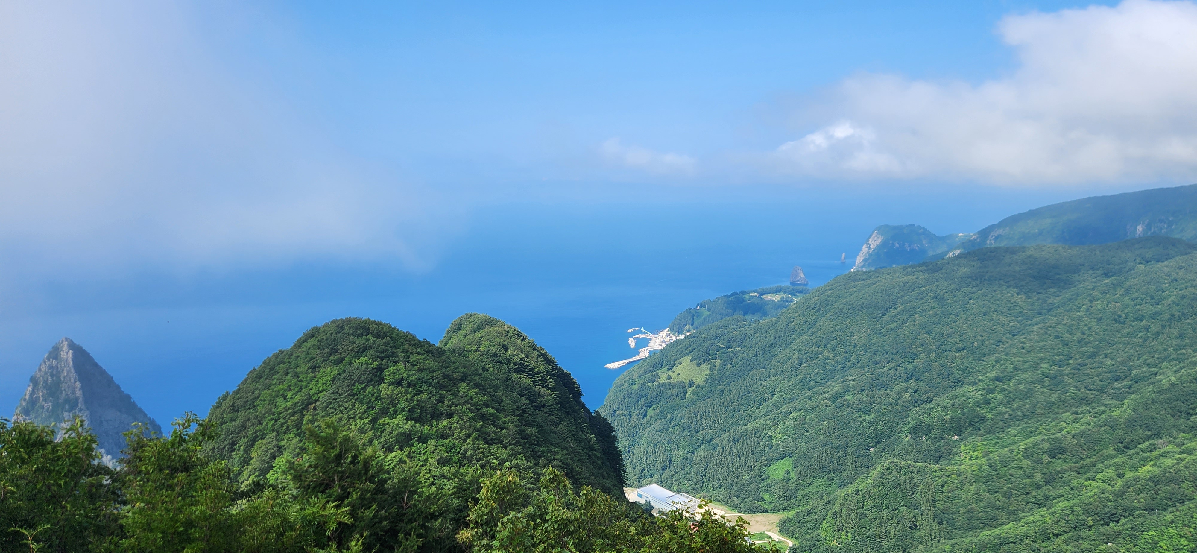 시야가 조금씩 열리며 탁 트인 풍광이 나타난다.가스가 꼇다 열렸다를 반복하면서 울릉도 북쪽 해안의 아름다운 풍광이 나타난다. 나리분지 전체가 조망되고 북쪽 해안이 넓게 열린다. 아마도 울릉도 최고의 풍광을 보여주고 있는 듯이다.