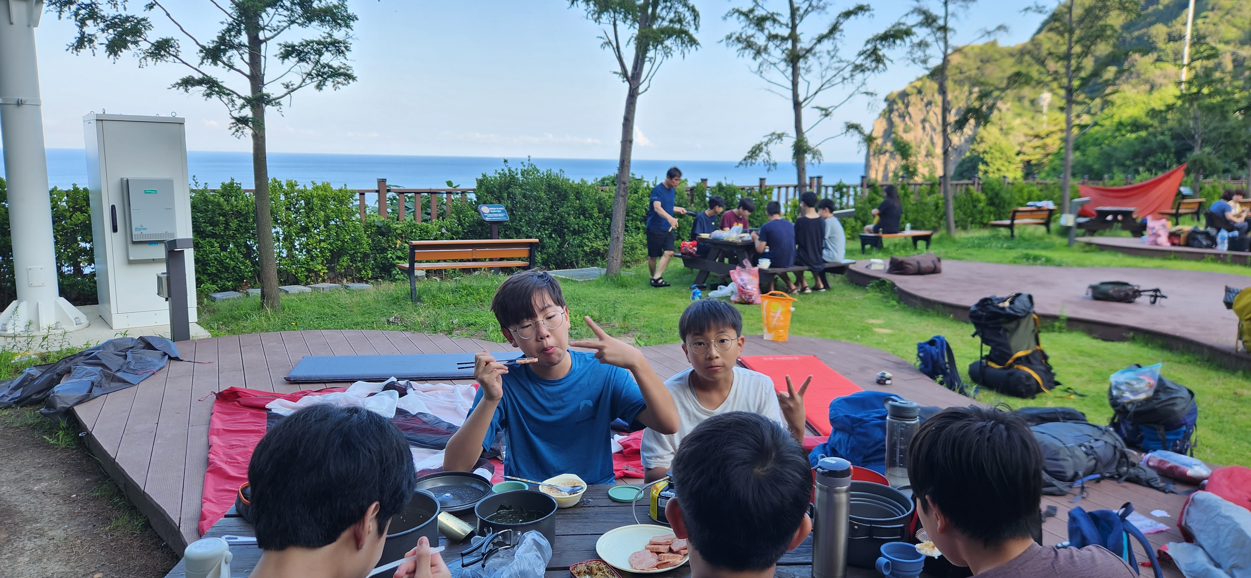 모노래일을 타고 내려와 향목 모노래일 정류장 옆에서 점심을 먹기로 한다. 바닷가지만 수도가 있어 라면을 끓여먹기 딱 좋은 곳이다. 라면이 끓어, 먹으려는 찰라 한 녀석이 앗! 뜨거 를 외치며 수돗가로 달려간다. 1학년 하준범 대원인데, 확인해 보니 버너를 만지다가 손가락에 화장을 입은 것이다. 상처가 하얗게 부풀고 있다. 구급낭의 약들로 응급처치를 하고 이후 병원에서 치료를 받았다. 10년 전에도 손형호 대원이 끓는 국을 엎어 다리를 데였었다. 늘 그렇지만 잠시만 방심하면 안전사고가 일어날 수 있다.