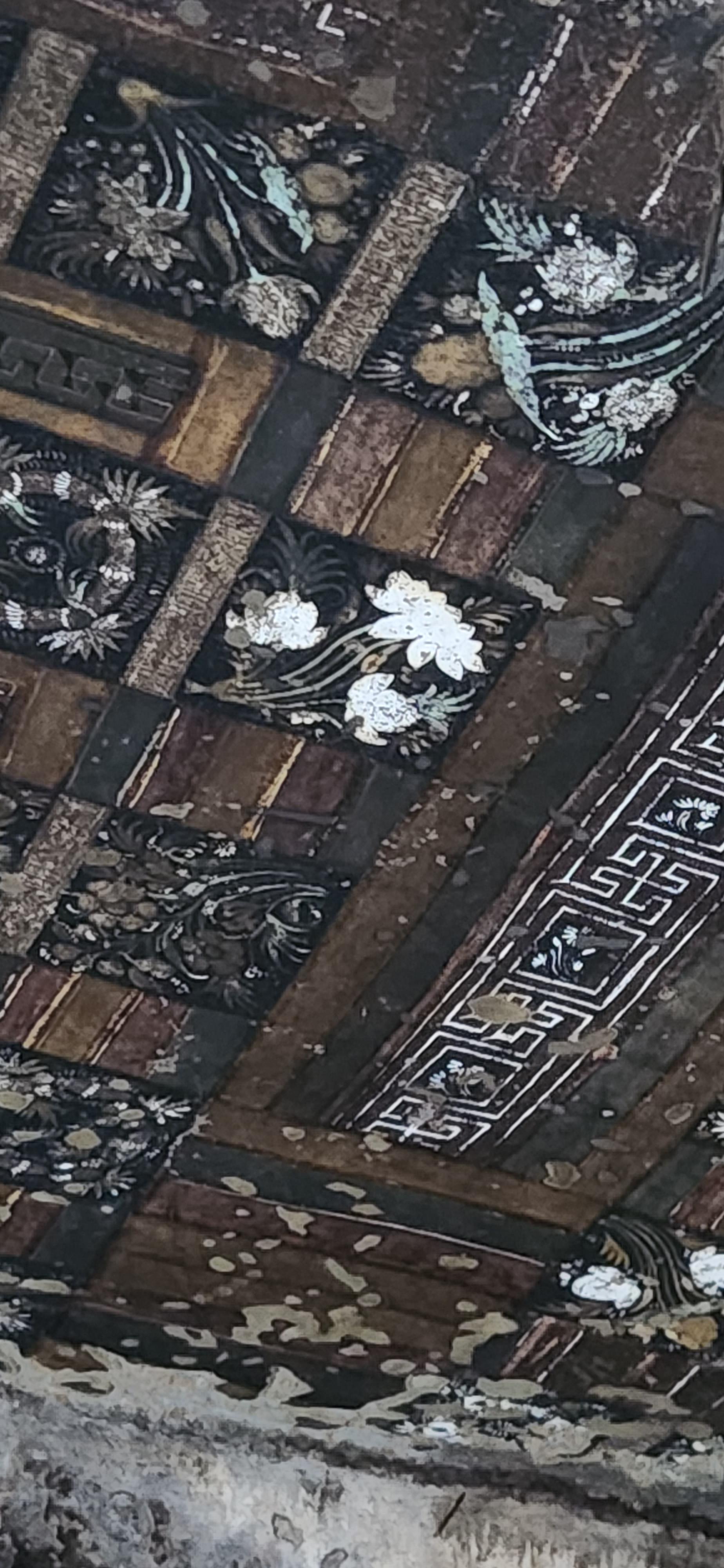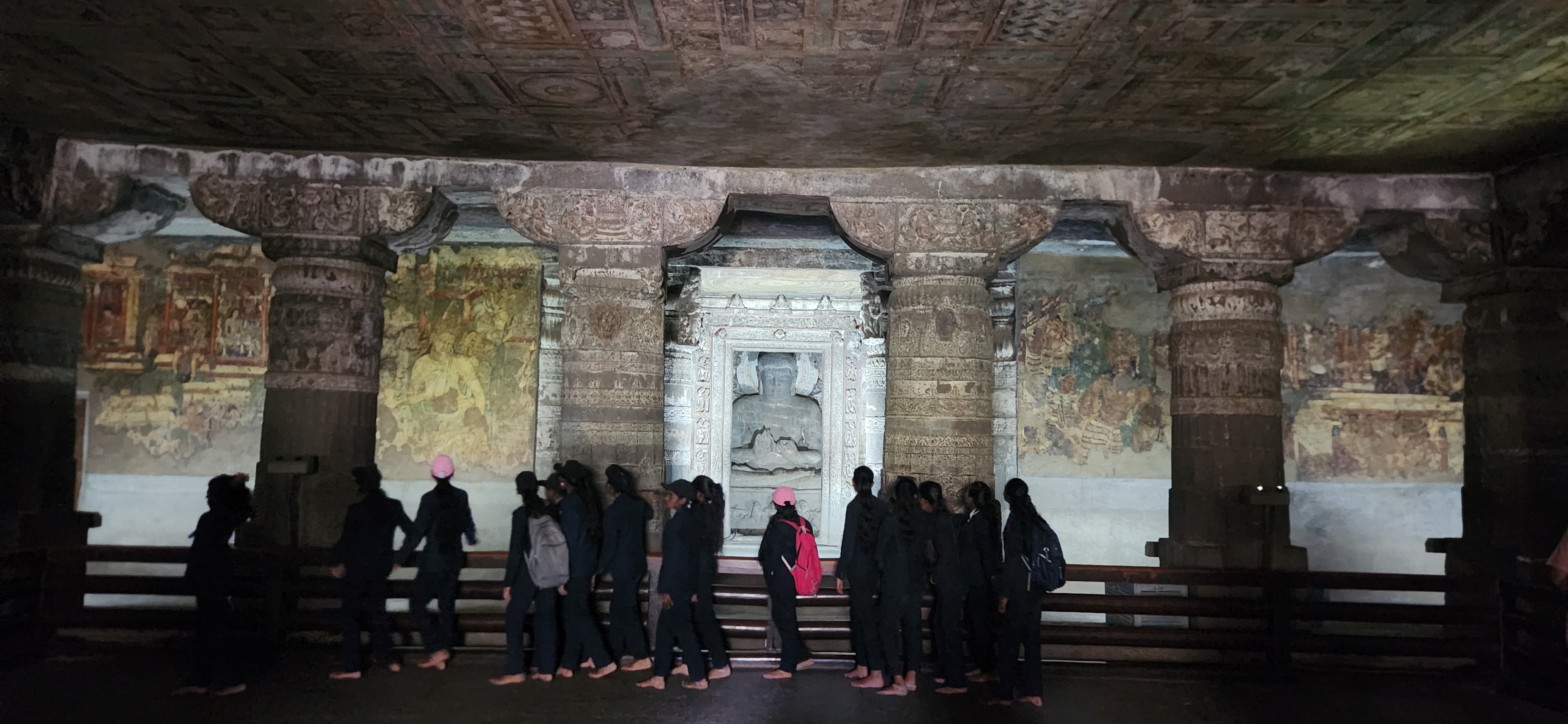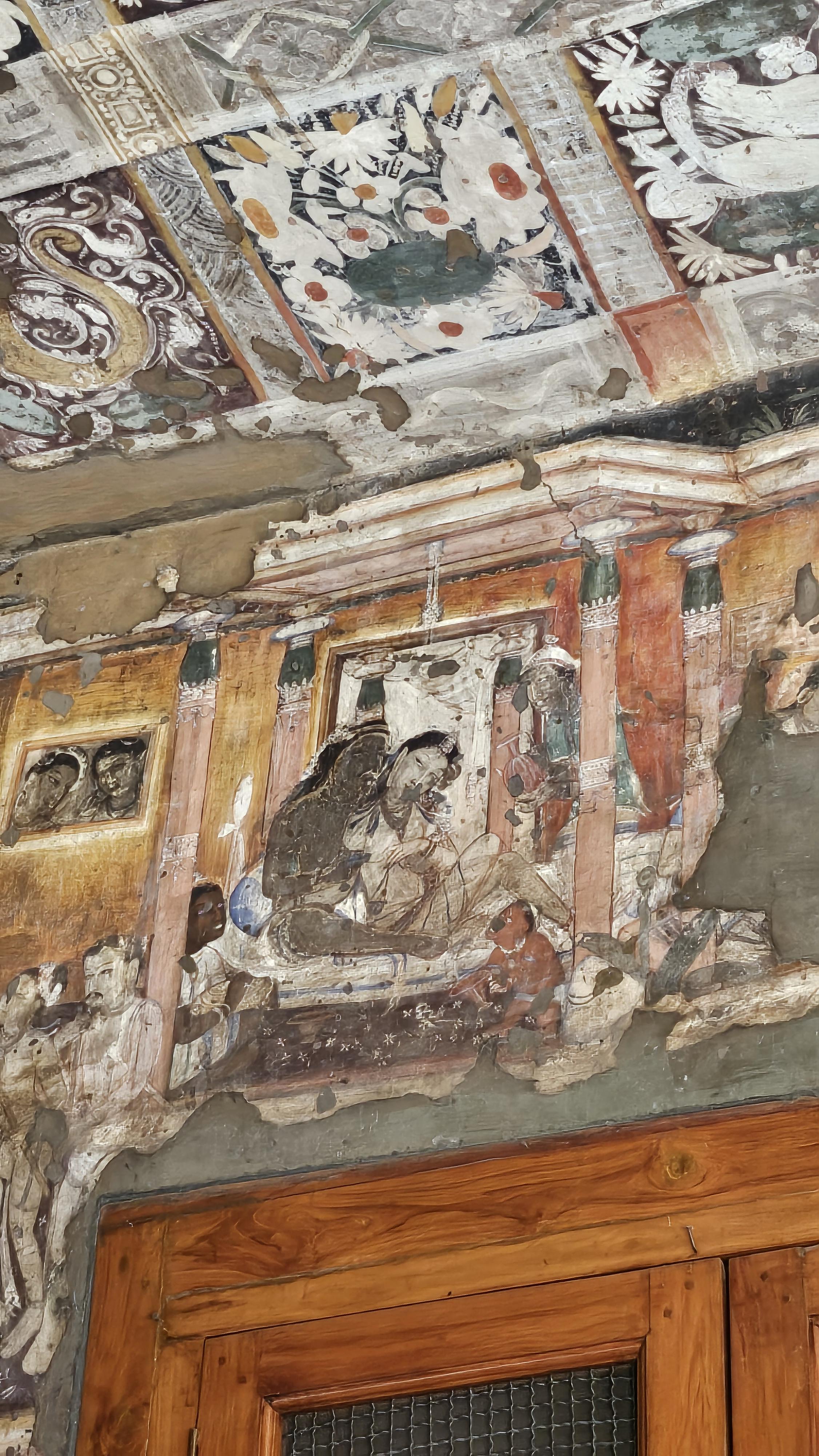아잔타 석굴의 천장은 대부분 식물과 꽃문양으로 장식하고 있다. 아잔타 석굴의 안료는 대부분 돌가루 같은 천연재료들을 사용하였는데 그런데 마치 어제 그린듯 유난히 선명한 색을 자랑하는 꽃들이 보인다. 관리인에게 물어보니 코끼리 상아를 가루내어 안료로 사용했다는 것이다. 2000년이 지났지만 너무나 선명하게 빛을 바라는 연꽃이다. 석굴의 내부는 석굴 아래쪽을 흐르는 와고라 강을 가득메운 강렬한 햇살과는 대조적으로 너무나 어둡고 고요하다. 석굴 내부에 조각된 형상과 벽화들을 제대로 보려면 잠시 눈이 어둠에 익숙해지기를 인내심을 가지고 기다려야 한다. 그러면 곧바로 수많은 부처와 보살들, 왕과 성자들, 매혹적인 궁권의 여인들, 무희와 악사들, 연꽃 향기 가득한 연못, 동물들의 재빠른 움직임이 조화를 이루며 살아 움직이는 한편의 거대한 드라마가 눈앞에 펼쳐질 것이다.