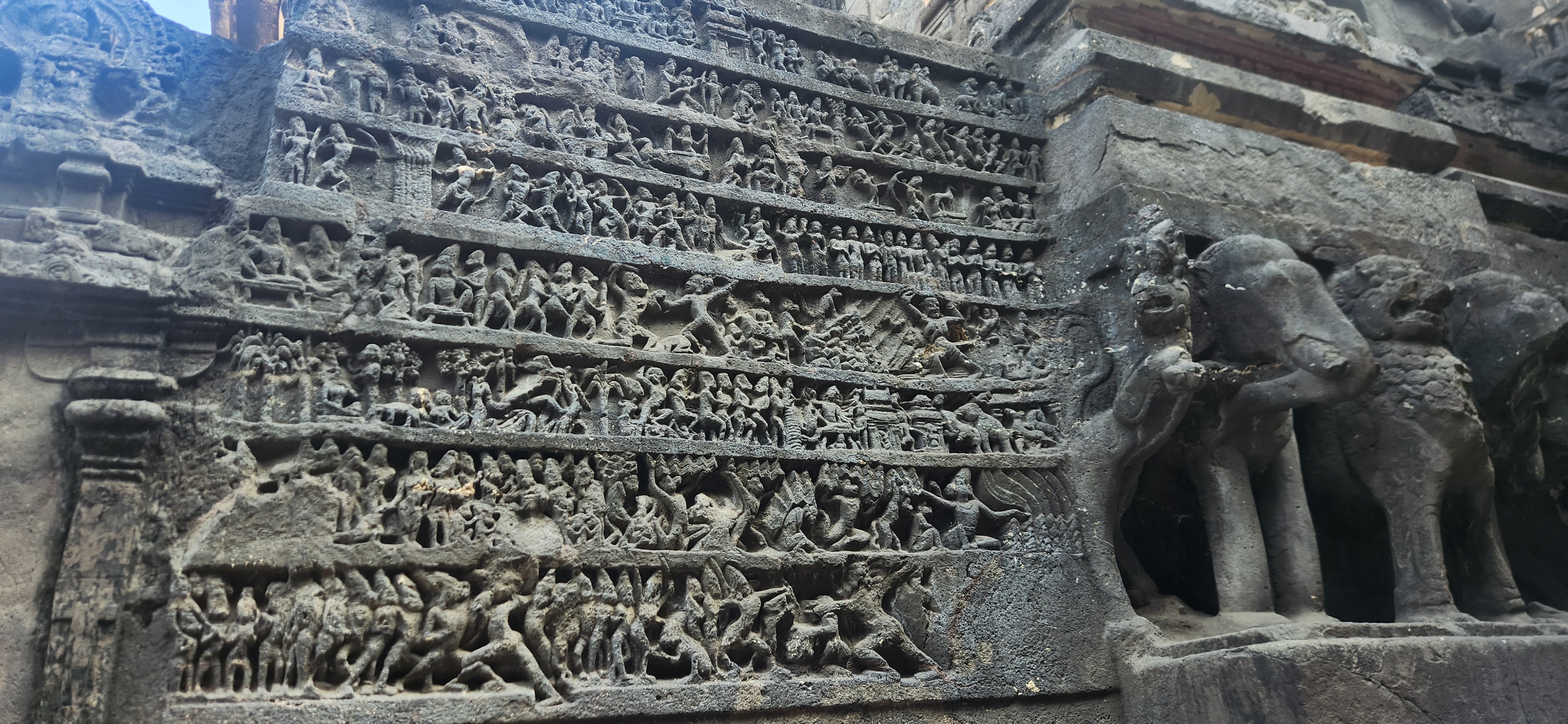 신전에는 인도인들이 좋아하는 이야기 구조의 신들의 이야기가 새겨져 있다. 그중에는 인도의 대서사시 '라마야나'의 이야기도 조각되어 있다. 스리랑카의 왕 라바나가 카일라스 산을 뽑아버리려고 하자 시바신이 발가락 하나로 그를 제압했나는 것이다.