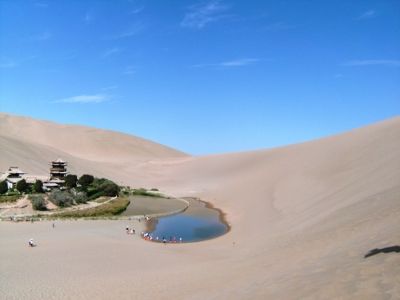 초승달 모양의 월아천은 2천년전부터 사막의 나그네에게 물을 대어주던 생명의 오아시스입니다. 길이가 동서 224m 남북으로 최대 39m 깊이는 5m 됩다고 합니다. 월아천은 곤륜산맥의 물이 당하강을 거쳐 지하로 흐르다가 지대가 낮은 이곳으로 솟아난 것입니다. 전설에 의하면 돈황이 황량한 사막으로 변하자 선녀가 슬퍼서 눈물을 흘렸고 이 눈물이 샘을 이루었다고 전해집니다. 선녀의 눈물이든 아니든, 월아천은 황량한 모래사막 한가운데 솟아나 연못을 이루며 신비감을 더 합니다. 월아천이 도교의 성지로 불리며 도관이 만들어진 것도 어쩌면 너무 당연해 보입니다. '산은 호수로 인해 더 아름답고, 호수는 산으로 인해 보다 유명하며 아름답다'는 말이 너무도 어울리는 곳이 월아천입니다.