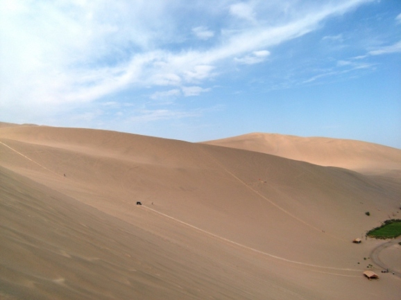 나무계단을 밟고 모래 언덕을 올라봅니다. 물론 나무계단은 모래언덕 등산용으로 설치된 것이 아닙니다. 언덕 중간에 설치해 놓은 모래썰매를 위한 것이지요. 썰매는 당연히 유료지요. 중국인이 어떤 넘들입니까^^ 그리 높아 보이지 않는 언덕인데 만만치가 않습니다. 중간이후로 계단이 없어지고 더욱 더 올라가기가 쉽지 않습니다. 그냥 내려가자니 보는 눈이 많습니다^^ 낑낑대며 20여분 걸려 올라오니 월아천이 보입니다.