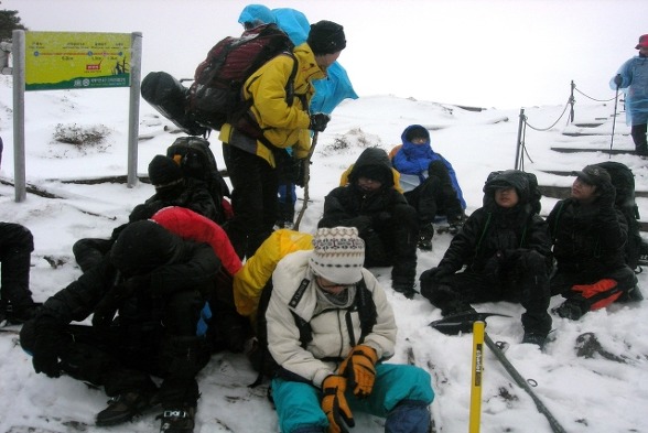 눈이 내리기 시작하니 풍광은 좋습니다. 역시 한라산은 눈이 있어야 제격입니다. 그러나 용진각부터 백록담까지 불과 1.9km밖에 안 되는 거리, 가장 급경사인 한라산 최고의 난코스입니다. 아이들 절반은 아이젠이 없습니다. 소선생이나 저는 스틱을 사용하기 때문에 아이젠을 착용하지 않습니다. 그래서 필수 준비물에도 아이젠은 없습니다. 미끄러워서 아이들 고생이 심합니다. 물론 나중에 내려갈 때에 비하면 아무것도 아닙니다만. 나중에 하산 할 때 몇 녀석은 10m에 한번씩 넘어집니다. 그렇게 넘어지고도 멀쩡한 걸 보니 역시 아이들입니다. 어른들이면 골병이 들었을 것입니다. 결국 아이젠 한 쪽을 나눠 신고 서야 덜 넘어집니다.