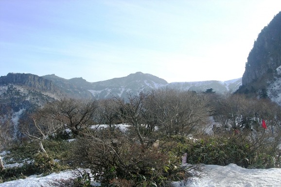 라면 먹은 힘으로 삼각봉이 보이는 능선에 올라섭니다. 전체 경치가 조망되기 시작합니다. 가운데 보이는 뾰족한 곳이 백록답입니다. 아마도 이 구간이 한라산 전체에서 가장 풍광이 좋은 구간인 것 같습니다. 한라산은 산 크기에 비해 등산로가 턱 없이 적습니다. 해발 1950m 남한최고봉에 153 ㎢의 면적의 세계자연유산으로 등록된 면면에도 불구하고 겨우 4개의 등산로가 있을 뿐입니다. 왜 이리 등산로가 적을까요.