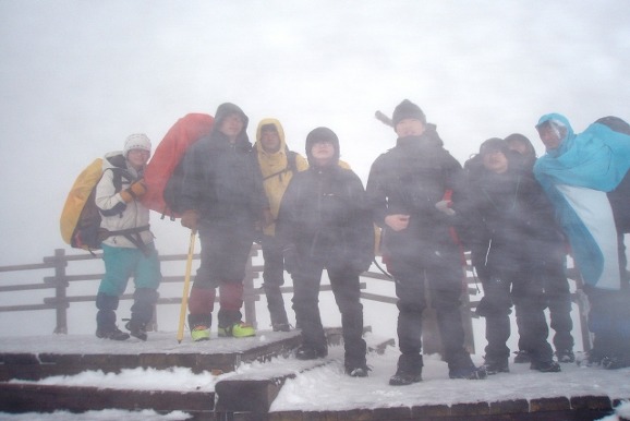 힘들게 헬기장에 올라섭니다. 운행을 시작한 지 한시간이 조금 더 지났는데 아이들은 파김치가 되었습니다. 그 사이 눈이 비로 바뀌며 눈비가 오락가락합니다. 갈 수록 운행 속도는 늦어지고 물에 젖은 배낭이 어깨를 짓누릅니다. 백록담에 올라서기도 만만치가 않습니다.