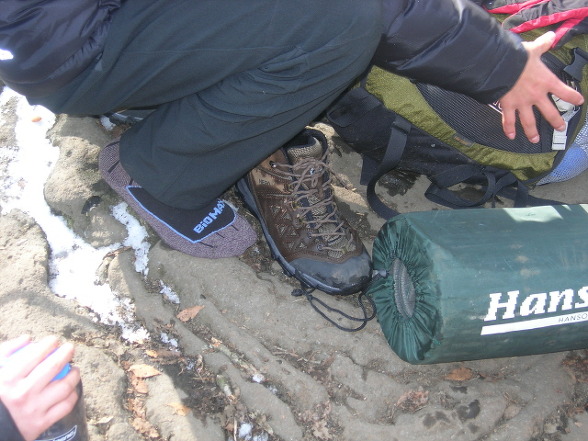 제가 신고 있는 파란 신발, 그리고 노란색의 소선생 신발이 학생들과 달라보입니다. 프라스틱 신발입니다. 프라스틱으로 무슨 신발을 만드냐구요. 그러게요. 흔히 코프라치라 블리는 프리스틱 신발은 빙벽할 때와 장기 해외원정을 갔을 때 매우 유용합니다.방수처리도 잘 되어 있습니다. 또 이중화로 되었 있어 신발 내피는 텐트에서 그냥 신고 잠니다. 따라서 겨울에 매우 유용합니다만 치명적인 단점이 하나 있습니다. 무겁다는 것이지요. 그리고 신발 바닥이 꺽이지 않습니다. 방수처리가 미흡하던 예전에는 무척이나 선호했던 신발입니다만 고어텍스 신발이 일반화된 지금, 일반 등산에는 잘 신지 않는 신발이 되어 버렸습니다. 그럼 소선생과 저는 왜 저 신발을 고집하냐고요. 겨울등산화가 이것 밖에 없습니다^^