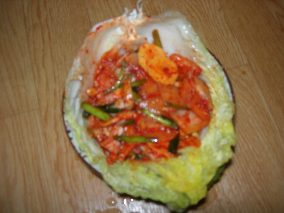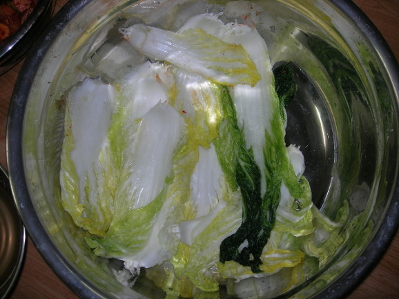 이 속재료는 절여진 배추잎으로 싸야합니다.