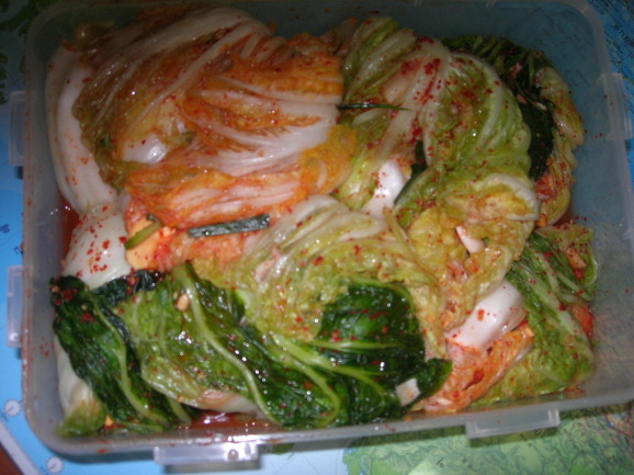 배추잎으로 싼 김치를 김치통에 넣습니다. 물론 김치잎이 풀어지지 않게 주의해야 합니다.