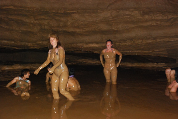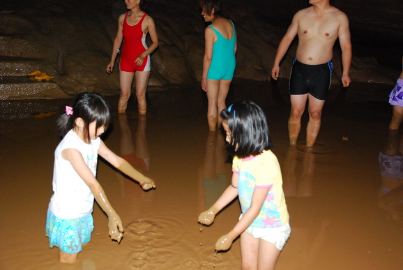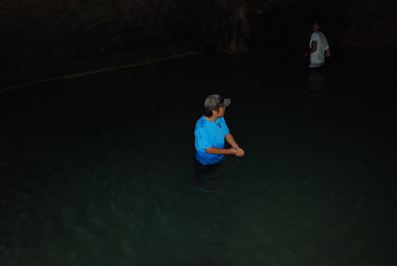 먼저 석회암 동굴이니 물이 있습니다. 거의 수영장에 다름 아닙니다. 깊이는 보시는 바와 같이 허리까지 오는데 바닥은 수영장처럼 평평합니다.