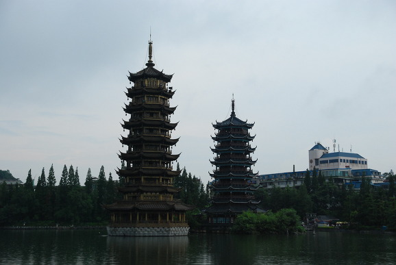 계림은 이강과 도화강을 양끝으로 해서 4개의 호수가 남쪽에 자리잡고 있습니다. 위에 보이는 것은 이 4개의 연결된 호수에 있는 일월탑입니다. 흔히 두개가 같이 서 있는 이런 탑들은 대칭적인 이름이 많습니다. 일월탑, 음양탑, 천지탑 등등. 우리나라도 그렇지요. 재미난 지형으로 유명한 전북 마이산에 있는 돌탑도 음양탑입니다. 아마도 탑사를 만든 이갑용처사가 숫마이산 암마이산을 보고 지은 이름인 것 같습니다. 가서 보면 암마이산은 너른하고 봉근하게 솟아있고, 숫마이산은 날카롭고 뾰족하게 솟아 있지요. 그런데 재미난 것은 암마이산은 등반이 허용되는 데 숫바이산은 출입금지라네요. 이유를 물어보니 숫마이산을 사람들이 밟아대 산이 자꾸 커지기 때문이라네요^^