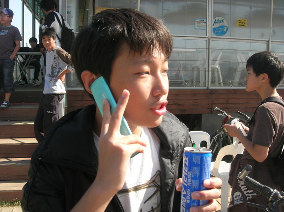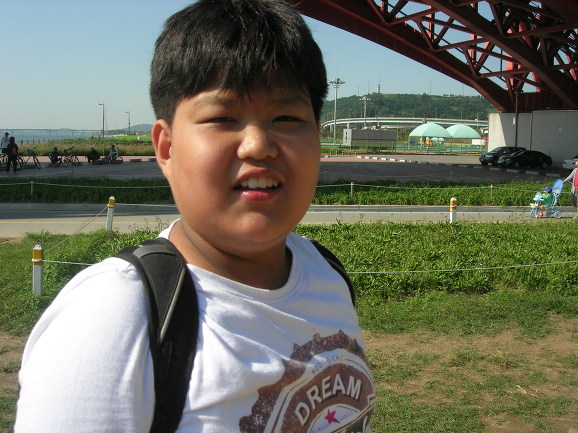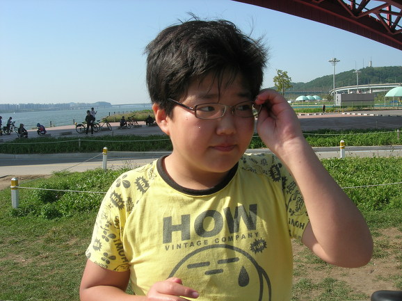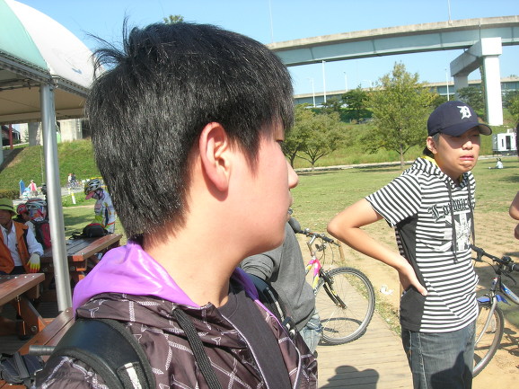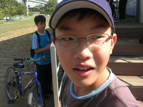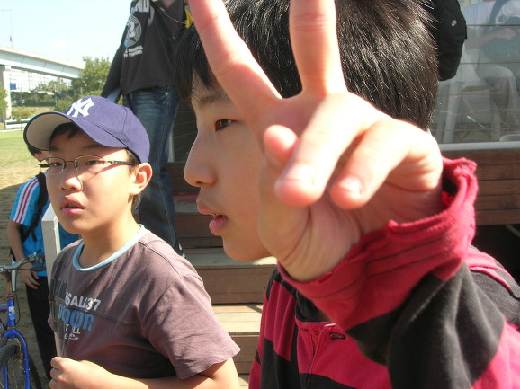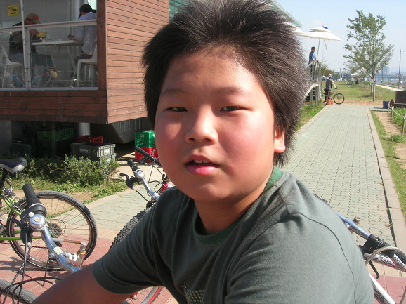 윤식이가 드디어 석현이를 태우고 왔군요. 뒤에 앉은 석현이가 자전거 못타는 단 한명입니다. 반포대교 북단에서 남단으로 건너왔습니다. 그런데 한 녀석이 안 보입니다. 사연은 이렇습니다. 두녀석이 2인용 자전거가 신기하고 재미있어 보이자 자전거를 바꿔타자고 합니다. 위에 보이는 석현이 녀석, 고개를 끄덕입니다. 다른 두녀석 2인용자전거 타고 신나게 다리를 건넜습니다. 문제는 석현이가 자전거를 못 탄다는 것이죠. 혼자서 끌고 옵니다. 이런.... 너무 착해도 탈입니다^^ 저한테 엄청 혼난 윤식이가 언른 가서 석현이를 태우고 옵니다.