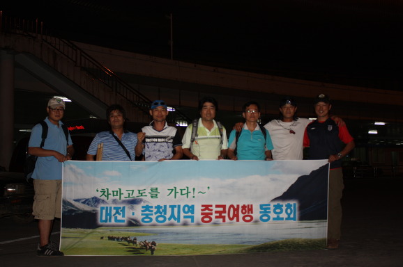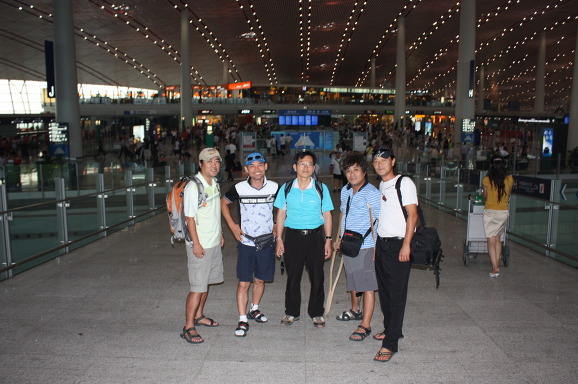 공항에 모여 전의를 불태우고 있군요. 2009년 8월3일 대전충청지역 중국여행동호회 회원 5명이 모였습니다. 오른쪽부터 막강파워미키님, 음악티.사랑방손님.스테파노님, 그리고 저 깜장소입니다. 어째 이름은 거창하게 '차마고도원정대' 라 붙였으나 행색은 쫏겨난 가출청소년 비슷합니다^^
