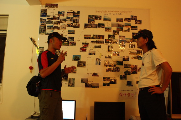 경원이가 보이는 군요. 이번에 저희팀의 안내를 맡아주었던 친구, 쾌활 정경원이라고 하지요. 차마고도에 관해 둘째가라며 서러워 할 전문가입니다. 지난번 KBS 차마고도 찰영팀의 안내도 담당했구요. 아마도 이 친구를 만나 도움을 받은 것이 이번 여행의 가장 커다란 성과가 아닐까 합니다. 차마고도 전반에 관한 해박한 지식뿐 아니라 차마고도 전 루트가 그의 머리 속에 들어 있습니다. 위에 보이는 사진들은 윈난성 관광루트 전체를 표시한 것인데 경원이는 쳐다도 안보고 윈난성 넘어 라싸까지 가는 모든 도시와 길의 위치를 그려냅니다. 모든 일행들이 혀를 내 두릅니다. 경원이는 또한 푸얼차의 명인이기도 하구요. 해박한 지식뿐아니라 푸얼차를 직접 생산하는 몇 안 되는 한국인입니다. 나중에 다시 설명드릴 기회가 있겠지요.