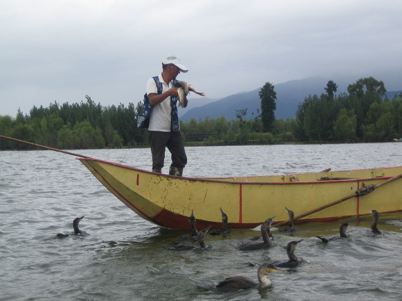 얼하이에서는 가마우지로 물고기를 잡는다고 합니다. 구경 안 하고 갈 수 없지요. 가마우지 목을 줄로 묶고 물속으로 던지면 이 녀석이 물고기를 잡아서 삼키지는 못하고 물고만 있습니다. 그리고 입안에 있는 물고기를 수확(?)하는 것입니다. 재주는 누가 부리고 뭐는 누가 챙긴다고... 애들 말로 표현하자면 가마우지 삥뜯는 것이라 하겠습니다^^