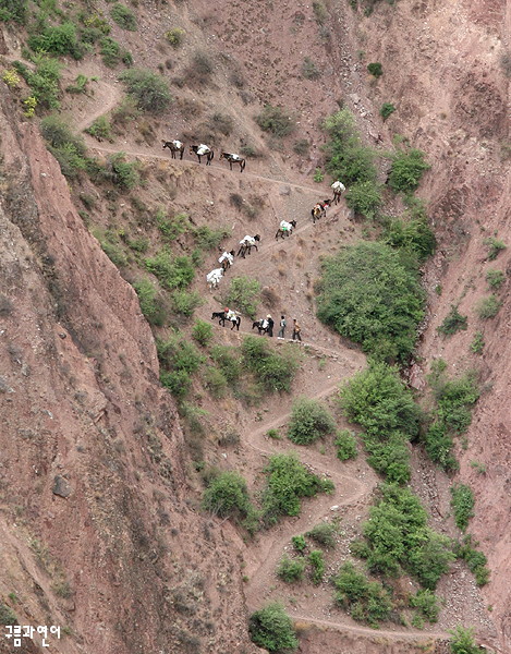 마방의 노새에게는 등급이 있습니다. 가장 중요한 것은 선두와 두번째, 그리고 후미 노새입니다. 선두노새는 반드시 암컷을 세웁니다. 암컷노새는 온순하고 위험에 대처하는 능력이 뛰어납니다. 따라서 암컷 노새 중에서도 가장 튼튼하고 경험이 많은 노새가 선두를 맡게 됩니다. 그리고 선두 노새는 누구라도 알 수 있도록 가장 화려하게 치장을 합니다. 두번째에 세운 숫컷 노새는 선두와 호흡을 맞추며 전체 대열을 이끌어 갑니다. 그리고 중요한 녀석이 후미 노새입니다. 수 많은 노새로 이어진 행렬은 항상 뒤와의 거리가 문제입니다. 때로는 그 거리가 굉장히 길어지기도 하구요. 따라서 맨뒤에는 강인 젊은 노새를 배치해서 속도를 조절하게 됩니다.
