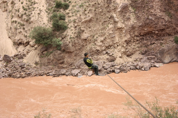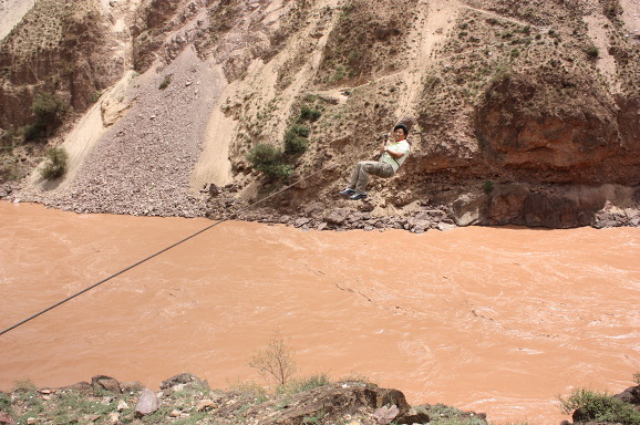 막강파워미키님이 일행 중 일착으로 건너봅니다. 도르래 한개, 줄 한토막, 그리고 유일한 브래이크 장치인 박스종이 이 세 가지로 순식간에 란창강을 건넙니다.