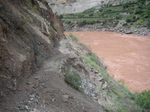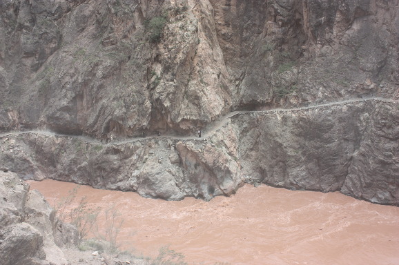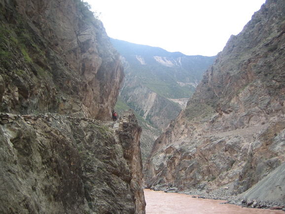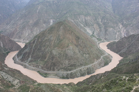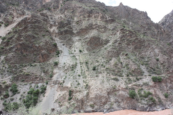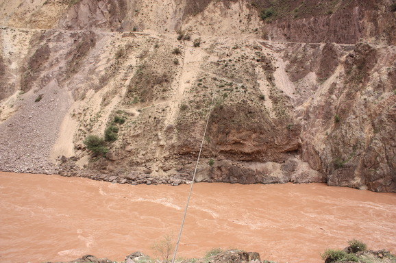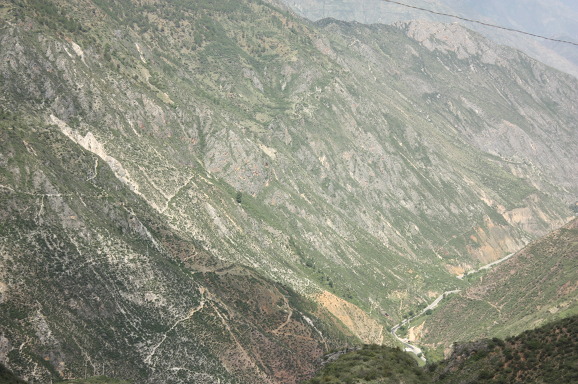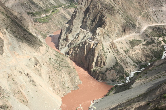 드디어 TV에서나 보던 차마고도 길들이 나타납니다. 도대체 저런곳을 어떻게 걸어다녔나 상상이 가지 않습니다. 보이는 강은 진사강(金沙江) 줄기로 양쯔강의 상류입니다. 조그맣게 보이지만 우기라서 수량도 많고 물살로 무척 거셉니다.