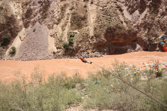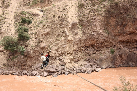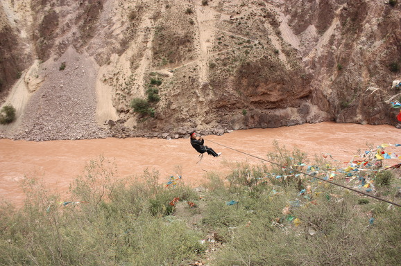 외줄타기 장소에 도착합니다. 엄청난 급류가 흐르는 란창강(메콩강상류)에 달랑 걸려있는 외줄입니다. 강폭은 대략 200m 정도. 이런 외줄다리는 가는 줄과 오는 줄 반드시 두개가 나란히 걸리게 됩니다. 약간의 경사를 주어 자연스럽게 타고 내려가도록 만들어 놓습니다.