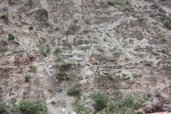 위험스런 차마고도 길을 걸어가는 저희 일행이 보이는 군요. 길이 무너지지 않고 버티고 있는 것이 신기할 정도입니다. 란창강 물줄기는 엄청난 속도로 흘러갑니다.