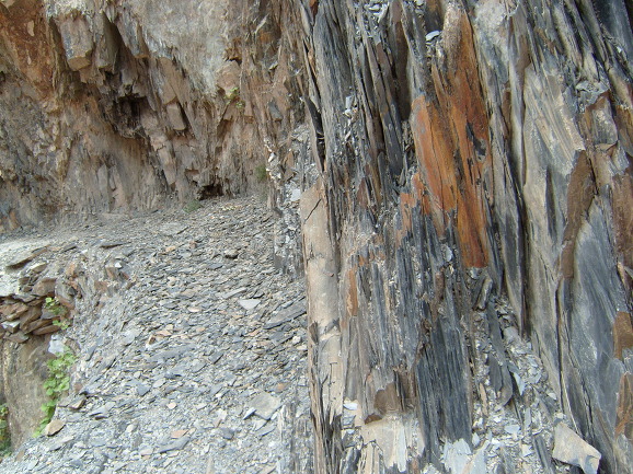 가까이서 보면 바위가 결이 있고 매우 약한 재질임을 알 수 있습니다. 간단한 손망치로도 쉽게 부술 수 있습니다. 이렇게 차마고도길은 하나하나 사람손으로 깨고 파서 만들어 놓은 것입니다.