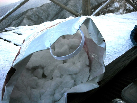 눈 주머니입니다. 대부분 겨울산행은 눈을 녹여 먹게됩니다. 구태어 물을 찾지 않아도 되니 장점이기도 하지만 눈 녹은 찝질한^^ 물을 먹어야 하니 단점이기도 합니다. 그런데 눈 주머니 같은 이런 사소한 준비물들이 겨울산행을 편하게 만들어 줍니다. 눈주머니가 없으면 눈이 필요할 때마다 매번 코펠들고 밖으로 나가야 합니다. 겨울에 양말까지 갈아신고 텐트 안에 자리 잡았는데, 영하20도가 넘는 밖에 갔다오라고 하면 좋아할 사람 아무도 없습니다.