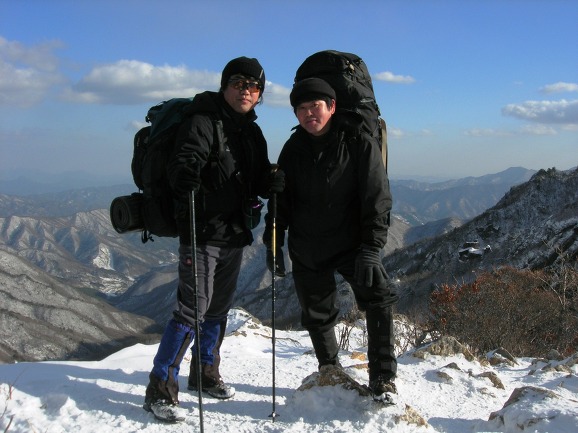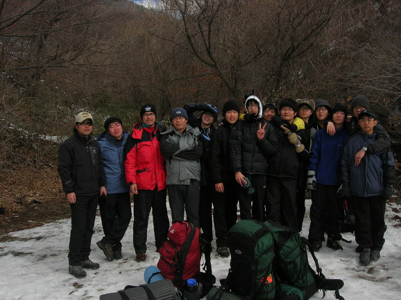 박선생 배낭이 많이 큽니다. 음식이 들어 있어 80L 배낭이 꽉 찼습니다. 산행은 무게와의 싸움입니다. 가급적 배낭을 가볍게 사는 것이 중요합니다. 문제는 그렇다고 필수적인 장비를 안 가지고 갈 수 없다는 것이지요. 적절한 조절이 필요합니다. 가볍고 부피가 작은 장비를 선택하는 것도 중요하구요. 물론 가볍고 부피가 적은 장비는 비쌉니다^^ 스틱도 산행에 아주 유용한 장비입니다. 특히 많은 짐을 지는 겨울산에서 유리합니다. 뭐가 유리하냐구요. 다리가 네개입니다^^  16명 중 아이젠을 안 가지고 녀석이 있어서 제 것을 빌려주고 저는 아이젠도 없이 산행합니다. 물론 스틱때문에 가능한 일입니다. 한번 써보시기 바랍니다. 이왕 쓰실 거면 두개를 쓰는 것이 유리합니다. 처음에는 불편하지만 익숙해 지면 아주 좋습니다.
