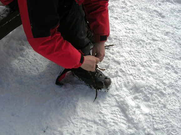설천봉 정상입니다. 이제 준비를 마치고 출발합니다. 설산 산행은 준비할 것이 많습니다. 몇가지 살펴볼까요 먼저 방수 신발이 필요합니다. 요즘에는 고어텍스 신발이 저렴한 가격으로 많이 나와 방수 신발에 대한 걱정을 덜게되었습니다. 예전에는 저녁마다 신발을 버너에 말리는 것이 가장 중요한 일과 었습니다. 그렇지 않으려면 완벽히 방수가 되는 프라스틱 이중화를 신어야 했습니다. 프라스틱 이중화는 아직도 고산 원정 산악인들의 필수품입니다. 문제는 무척 고가에다, 무겁다는 것입니다. 두번째로 챙겨야 하는 것은 스패츠입니다. 일종의 각반이라고 할까요. 신발이 아무리 좋아도 스패츠가 없으면 발목쪽으로 눈이 들어오게 됩니다. 겨울산은 아무리 사소한 것이라도 준비를 소홀히 하게 되면 그만큼 고생하게 됩니다. 거창하게 이야기 하면 준비의 미학이라고 할까요
