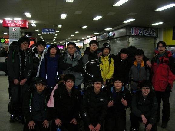 이제 출발입니다. 남부터미널에 모여서 단체 사진을 찍습니다. 그런데 올해는 어쩐 일인지 늦는 넘이 없습니다. 꼭 한놈은 늦게 오는데 말이지요. 너무 순조로운 출발인데요^^ 대원들 전체는 2,3학년들입니다. 1학년 녀석들은 뺀질거리며 다 빠져버리고 선배들만 와 버렸습니다. 뒷줄 오른쪽에서 두번째 계신분이 백택현 선생님되시겠습니다. 이번 산행의 가장 연장자이십니다. 늘 관심가져 주시고 챙겨주시는 숭문 산악부의 정신적인 지주라고 말씀 드릴 수 있습니다.