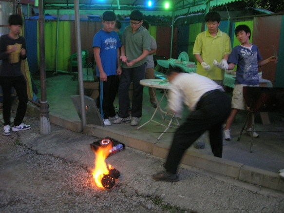 조별로 두 녀석이 굽고 나머지 녀석들은 먹습니다. 몇개조일까요? 7명씩 4개조입니다, 그럼 한반이 28명이군요. 예전에 비해 많이 줄었지요^^ 저 중학교 때는 72명이었습니다. 그 교실에서 지금 28명이 공부합니다. 지금 생각하면 어떻게 그 인원이 교실에 다 앉았나 모르겠습니다.
