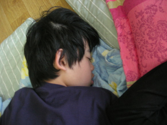밤을 껄랑세운 녀석들이 아침에 골아떨어입니다. 아이들 잠자는 모습을 한번 볼까요. 눈가려도 누군 다 안다 상규야!