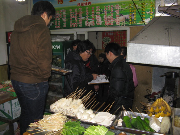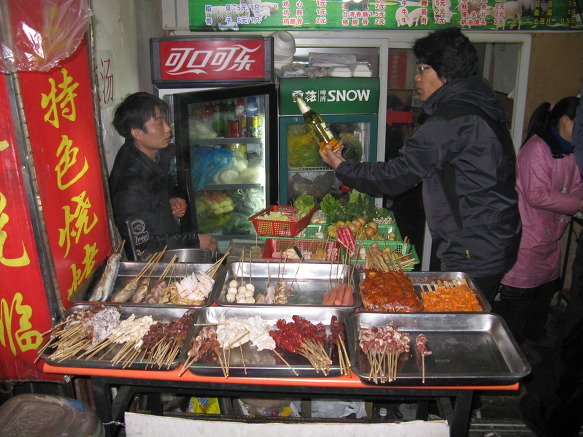 호텔에 짐을 풀고 호텔 뒷편에 있는 조그마한 야식 거리로 나갑니다. 중국와서 첫날밤에 첫번째 음식이라 다들 기대가 큼니다만 그냥 시장표 좌판음식 되겠습니다. 중국음식 특유의 향신료 냄새에 맛, 좀 힘들어할까 싶은데도 다들 잘 먹습니다. 제가 겁을 너무 많이 준 모양이네요. 사실 여행가는 즐거움 중에 하나가 먹는 것아니겠습니까? 그런데 중국이나 다른 남방 나라를 가면 특유의 향기때문에 고생하시는 분들이 많습니다. 방법은 그냥 참고 먹어보는 것이지요ㅎㅎ 자꾸 먹다보면 익숙해지고 어느새 좋아하기까지^^ 합니다. 다들 그런대로 잘 먹습니다. 그런데 문제는 다른 곳에서 터지네요.