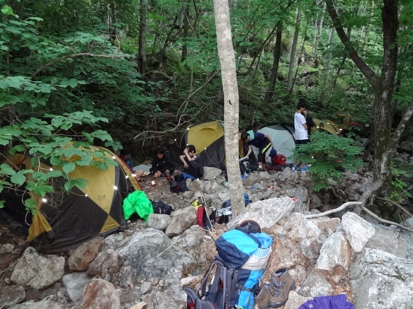 그래서 간신히 자리잡은 곳이 계곡 바로 옆의 돌밭입니다. 텐트 사이트가 비좁은 데다가 바닥의 돌이 평평하지 않아 텐트 4동 치기에 어려움이 많습니다. 그래도 텐트가 있고 없고는 하늘과 땅 차이 아니겠습니까^^ 계곡 바로 옆이니 밤에 비라도 오면 낭패입니다. 잠들기 전 비만 오면 위쪽으로 도망간다고 배낭을 다 꾸려 놓으라며 아이들을 단도리를 합니다.