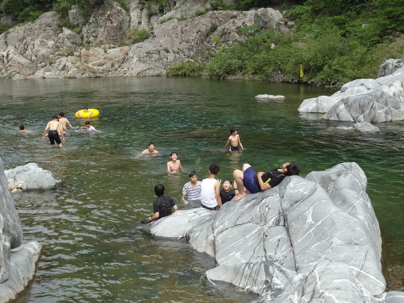뱀사골 계곡 하류로 갑니다. 상류로 가면 계곡물이 더 깨끗합니다만 들어갈 수가 없습니다. 이 계곡 상류 뱀사골 초입 야영장에 묶는 사람들을 보면서 언제나 하는 이야기지요. '물이 너무 차 못 들어 가는데^^' 산행 뒤에 맞는 여유로운 물놀이에 아이들 모두 신이 났습니다.
