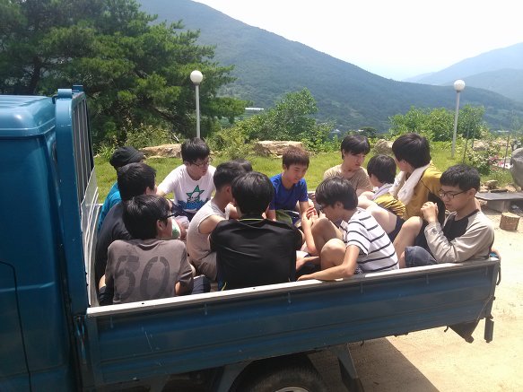뭐하러 갈까요? 트럭 얻어타고 뱀사골 계곡으로 물놀이 갑니다. 인원때문에 교통 수단이 적절치 않아 트럭을 타고 다닙니다. 물론 도시에서 짐칸에 타면 벌금을 내겠지만 시골에서 누가 뭐라겠습니까 ㅎㅎ 덕분에 아이들도 생전처음 트럭 뒷칸에 타고 바람을 맞아봅니다.