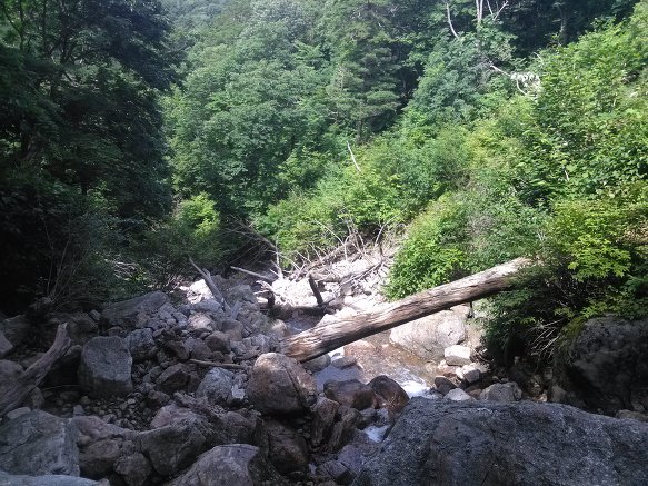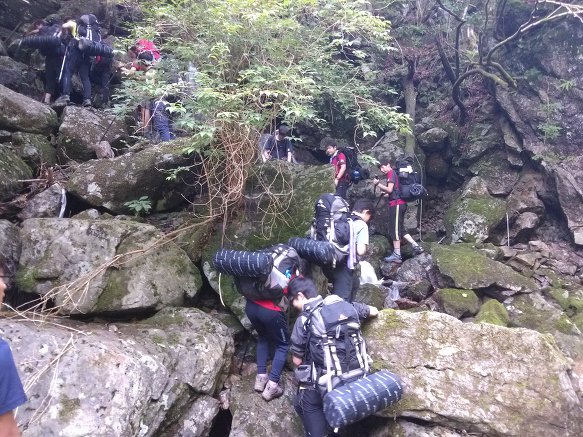 오전 8시에 등반을 시작한 다음날도 계속되는 악전 고투입니다. 길은 아예 없고 무조건 계곡을 칩니다. 잡목들이 무너지고 쓰러져, 가는 길을 방해합니다.