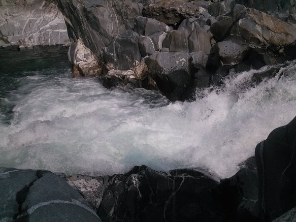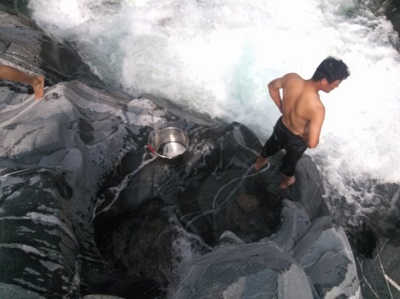 그 중에 몇마리가 물쌀에 밀려 옆에 파인 구덩이 일명 '요강' 속으로 떨어진다는 것입니다. 그러면 가서 그냥 주으면 되겠습니다. 이런 구덩이가 이 급류에 여러 곳이 있습니다. 기다렸다가 가서 건지면^^ 되겠습니다.