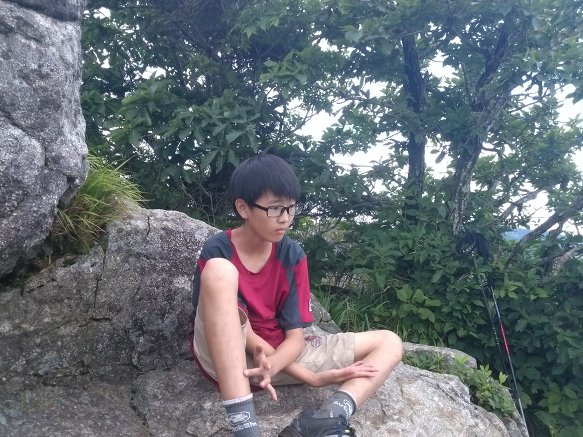 휴식 중 배낭을 보니 나무가지 붙어 있습니다. 툭쳐서 털어냈습니다만 갑자기 나무가지가 움직입니다.