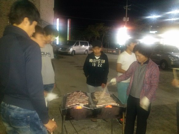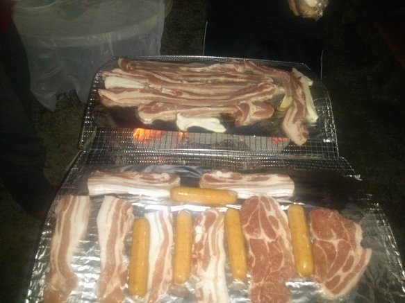 숯불구이로 거하게 한상 차려 댑니다. 얼마나 먹어 대는지 그 많은 고기들이 다 없어집니다. 일인 당 600g 한근은 먹었나 봅니다. 더 먹은 녀석들도 있구요.