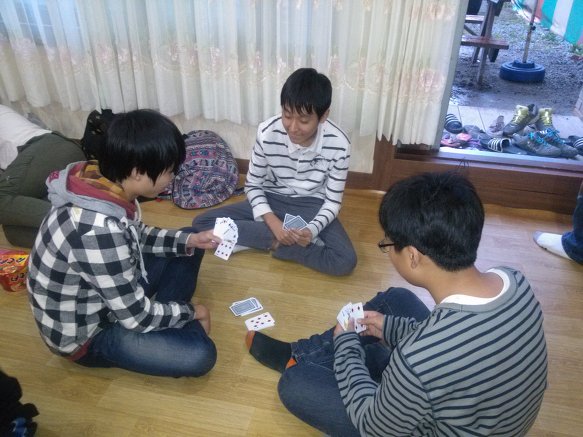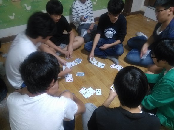 가끔 고스돕을 치기도 하지만 카드를 하는 녀석들이 대부분입니다. 아이들이 고스돕치고 카드 해도 되냐구요? 당연하지요. 이 긴긴밤 뭐하고 놀겠습니다. 이렇게 카드, 고스돕, 게임하면서 2/3 넘는 녀석들이 한잠도 안 자고 밤을 꼴랑 세웁니다.