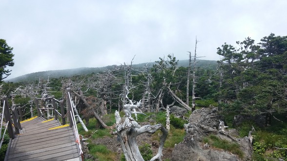 백록담에 거의 다 올라서니 고사목들이 보인다. 주목이 죽어 고사목 군락을 이루고 있다. 주목은 나무가 마디 자라고 재질이 단단해 오래 사는 것으로 유명하다. 죽어서도 오래 서 있어 '살아 천년, 죽어 천년' 이라는 별명을 가지고 있다. 이에 필적한 나무가 있을까? 몇 년 전 중국 실크로드 타크라마칸 사막을 간적이 있었다. 그곳에 호양목이란 나무가 단단하기로 유명하다고 현지인이 설명해 준다. 그래서 호양목의 별칭이 '살아 천년, 죽어 천년, 누워 천년' 이란다. 이쯤이면 주목보다 한수 위라고 할 수 있을까 ㅋㅋ 기념으로 호양목으로 도장도 하나 새겨서 지금도 잘 사용하고 있다.