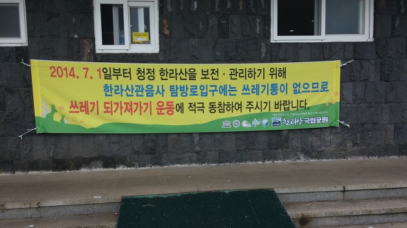 그런데 쓰레기 통이 없으니 자기 쓰레기는 가져 가라는 플랭카드가 보인다. 그럼 음식물쓰레기는 어떻게 하란 말인가? 어디에도 음식물 쓰레기를 버릴 곳이 없다. 결국 다음날 여기 저기 버려진 음식물쓰레기 때문에 관리사무소와 실갱이를 벌이게 되었다. 학생들을 비난하는 관리사무소 직원에게 한마디 한다. '그럼 음식물쓰레기 싸서 비행기타고 서울까지 가져가라는 말입니까? 우리가 제주도 사람도 아니고 이런 말도 안되는 정책은 누가 세운 겁니까..' 기세에 등등한 나의 태도에 관리사무소 직원이 꼬리를 내린다. 결국 우리 음식물 쓰레기를 관리공단 직원식당에서 처리해 주기로 한다. 차라리 설악산 야영장처럼 유료 음식물 쓰레기 봉투를 쓰게하면 될 일을 더 복잡하게 만드는 것 같다. 들어보니 담당자들은 실효성이 없다고 건의 하는데 위에서 그냥 진행하라고 한다며 하소연을 한다. 좀 더 현실을 반영한 실효성 있는 대책이 필요할 것으로 보인다