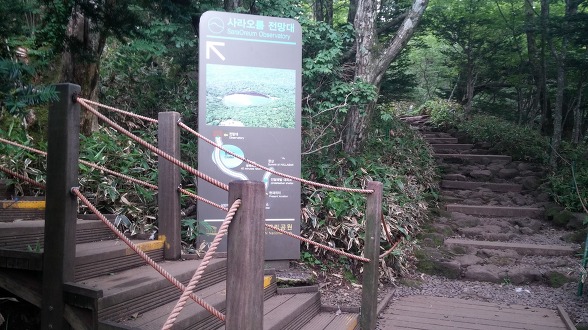 사라오름을 올라가는 입구가 보인다. 사라오름은 1300m가 넘는 곳에 위치해 제주도 내 386개의 오름 중에서 가장 높은 오름이다. 이 오름은 정상 분화구에 물이 고여 있다. ‘작은 백록담’이라 부를 수 있을 만큼 비밀스러운 호수가 분화구 속에 숨겨져 있는 것이다. 사라오름이 일반에 개방된 것은 2010년 가을이다.