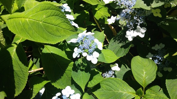 가다보니 산수국이 많이 보인다. 산수국 꽃은 산딸나무 꽃과 유사하다. 가운데 파란 것이 꽃이고 밖에 흐린 색은 꽃받침인 가짜 꽃이다.. 꽃이 너무 작아 벌을 유혹하느라 가짜 꽃을 만든다. 독특한 것은 고도가 높아 질 수록 가짜 꽃의 색깔이 더욱 진해진다는 것이다. 고도에 높아질 수록 벌을 유혹하는 데 좀 더 강렬한 색깔이 필요한 모양이다. 한라산은 야생화 나누어 주기 행사를 개최하는 것으로도 유명하다.