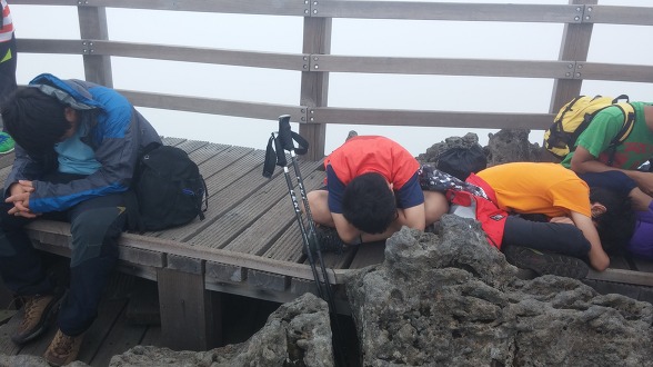 밤 늦게 자고 새벽부터 서두른 관계로 피곤했던 아이들이 하나 둘씩 앉아서 졸기 시작한다. 하긴 오랫만에 친구들과 텐트에서 마주 앉았으니 그냥 잠을 잘리 만무하다. 1학기수학여행도 못 갔으니 아주 밤을 세워서 떠들 기세다. 결국 새벽까지 시끄럽게 떠들던 아이들을 윽박질러서 재운다. 그리고 새벽에 기상을 했으니 잠이 많이 부족할 것이다. 지금이라도 백록담을 보여주면 좋으련만 무정한 구름은 전혀 걷힐 기색이 없다. 결국 30여분을 기다리다가 하산하기로 한다. 애고 이번에도 백록담을 보지 못하나 보다. 한라산을은 네번 와서 간신히 한번 백록담을 구경했으니 두번 가서 한번 구경했던 백두산 천지보다 더 인색한 모양이다ㅎㅎ