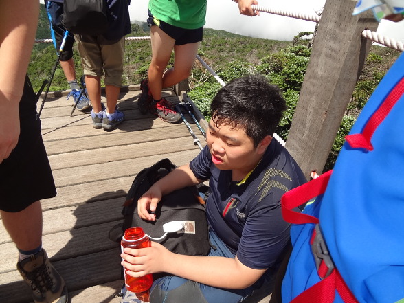 1학년 정한이 녀석이 간신히 도착, 힘들어 한다. 거의 100kg에 육박하는 몸무게에 평소 운동도 거의하지 않으니 여기까지 온 것만도 장한 일이다. 뒤로 쳐지지 못하게 선두에 선 소선생 뒷에 바짝 붙여서 운행을 시킨다. 힘들어서 어찌나 헉헉대는지 듣다 못한 소선생이 한마디 한다. '야 임마! 니 신음소리가 애로틱해서 운행을 못하것다' 이번 한라산 등반도 본인은 빠지고 싶어서 안달을 했는데 어머니가 반강제로 보내 버렸다^^ 지금은 많이 힘들어도 나중에는 좋은 추억거리가 된단다 정한아!