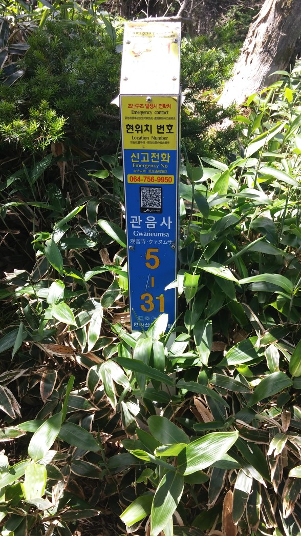 위치 표시 팻말이 보인다. 요즘 많은 산에 조난을 대비해서 설치 해 놓았다. 팻말의 내용과 뜻을 알면 아주 유용하다. 대부분 250m 마다 하나씩 설치한다. 앞의 숫자 5는 관음사 코스란 뜻이고 뒷번호는 31번째 팻말이라는 것이다. 그러니까 관음사 입구에서 31 X 250 해서 총 7.75km 왔다는 이야기다. 이 코스의 총길이가 8.7km이니 백록담까지 1km 남았다는 말이 된다. 국립공원에는 모두 설치 되어 있으니 번호로 지나 온 거리와 남은 거리를 다 환산할 수 있다. 유용하기 활용하시기를 바란다. 모두가 아는 얘기를 장황하게 떠드는 것은 아닌가 모르겠다^^