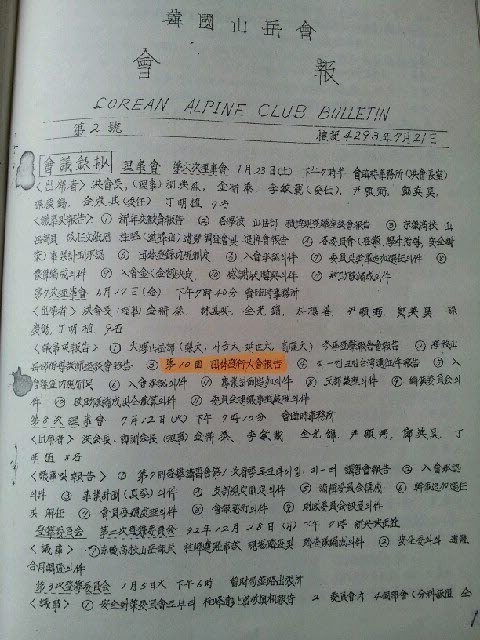 순간 눈이 번쩍 뜨이며 머리속이 환해졌다. 다시 말씀 해주시시지요. 박동욱고문님의 말씀을 정리하면 이렇다. 자료정리를 하다가 1960년 한국산악회 회보를 찾았다. 필사본으로 된 회보에는 1960년 5월 29일 열린 등반대회에서 숭문고 산악부가 고등부 1,2위를 휩쓸었다. 그것도 타의 추종을 불허하는 가장 빠른 기록으로. 바로 기록을 보여달라고 요청한다. 받고 보니 단기 4293년 7월에 발행된 한국산악회 회보인데 한자 필사본으로 또박또박 씌여있다.