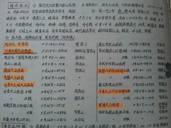 그 다음 장을 보니 국내 외 산악계소식과 대만에서의 사고, 그리고 대학산악부와 고교산악부의 하계훈련 계획이 정리되어 있다. 숭문고 소식도 있나 얼른 찾아본다. 숭문은 7월 25일 - 8월 3일 지리산으로 하계훈련을 가는 것으로 나와 있다. 여러가지가 궁금해 지기 시작했다. 1960년대 숭문산악부가 있었다는 것도 처음 듣는 것이고 더구나 1960년 등반대회에 나가 1,2위를 석권했다는 것은 더더욱 놀라운 일이었다.